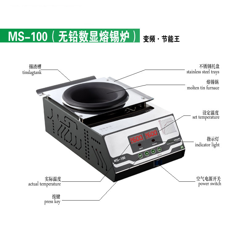 型號(Model) MS-100 功率(Power) 500W 溫度范圍(Temperature Range) 0-600℃ 錫鍋尺寸(mm)(Tin pot size) Φ100*40 外形尺寸(L*W*H)(External Dimension) 327*175*120 熔錫量(Melting Tin Quantity) 2.0KG 錫鍋材質(zhì)(Tin Pan Material) 純鈦(Pure titanium)