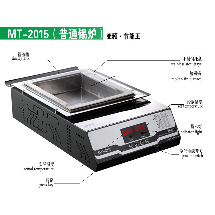 - YNATE美生MT-2015化錫爐方形融錫鍋 產(chǎn)品型號:MT-2015 調(diào)節(jié)溫度范圍0-400,適合用各類有鉛錫作業(yè)(請勿混用無鉛錫),使用304不銹鋼制作。壽命經(jīng)久耐用,尺寸可按客戶需求訂制。