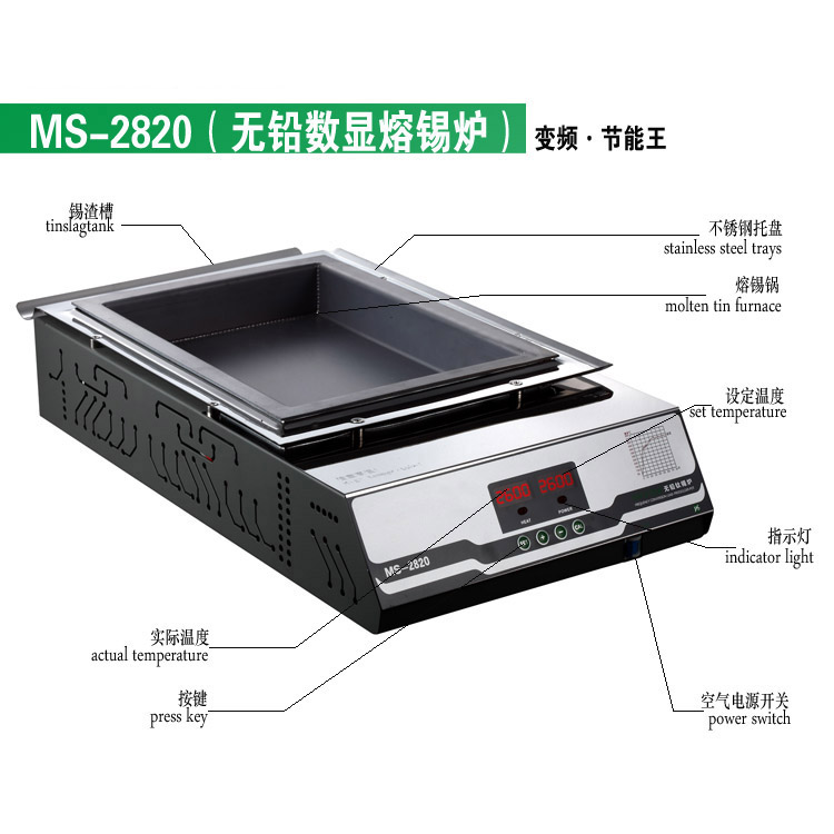 - YNATE美生MS-2820無鉛錫爐方形浸焊爐 產(chǎn)品型號:MS-2820 無鉛純鈦錫爐,溫度調(diào)節(jié)范圍0-600,適合用各類有鉛及無鉛錫(請勿混用),使用純鈦合金制作。壽命經(jīng)久耐用,可按客戶要求訂做各種尺寸錫爐