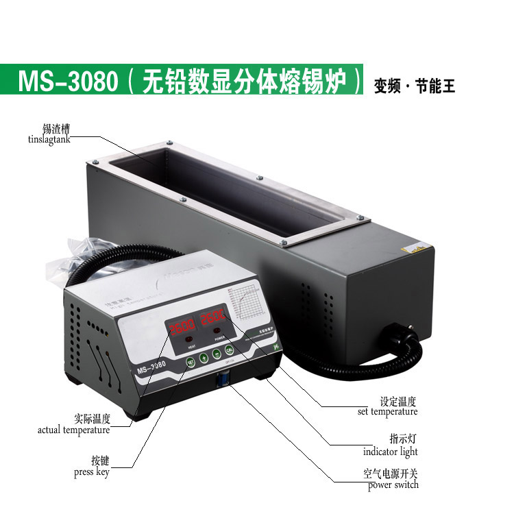 - MS-3080無鉛錫爐分離式方形純鈦錫鍋浸錫機(jī) 產(chǎn)品型號(hào):MS-3080 無鉛純鈦分體式錫爐,方便錫鍋擺放位置。溫度調(diào)節(jié)范圍0-600,適合用各類有鉛及無鉛錫作業(yè)(請(qǐng)勿混用),使用純鈦合金制作。壽命經(jīng)久耐用,可按客戶要求訂做各種尺寸錫爐