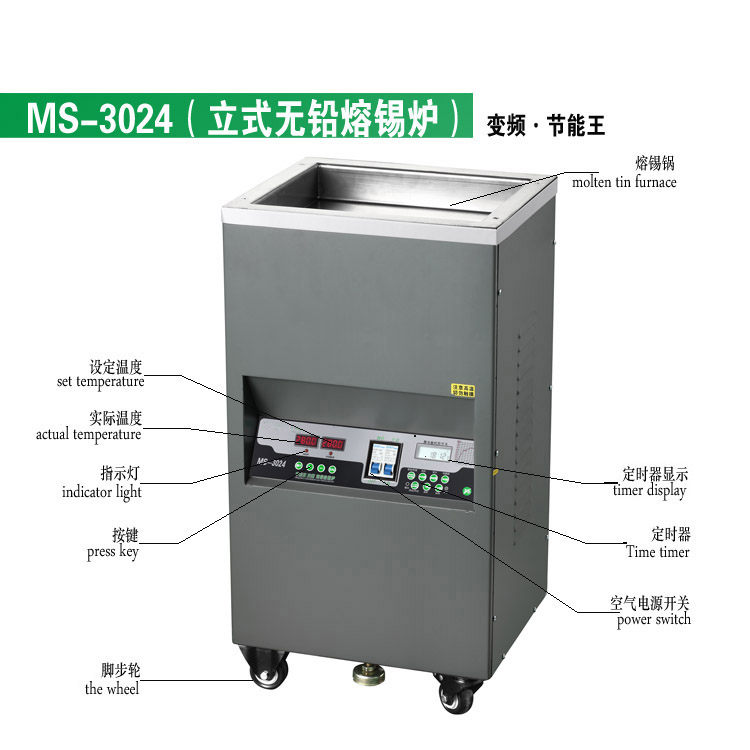 - 億納特美生MS-3024立式無(wú)鉛錫爐方形焊錫機(jī) 產(chǎn)品型號(hào):MS-3024 無(wú)鉛純鈦立式錫爐,大容量錫爐,設(shè)有腳輪,方便錫爐移動(dòng)。溫度調(diào)節(jié)范圍0-600,適合用各類有鉛及無(wú)鉛錫作業(yè)(請(qǐng)勿混用),使用純鈦合金制作。壽命經(jīng)久耐用,可按客戶要求訂做各種尺寸錫爐