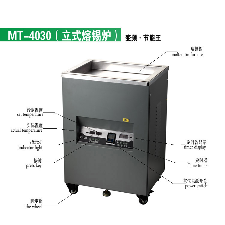 - 品牌浸焊機(jī)MT-4030立式方形不銹鋼錫爐普通融化有鉛錫 產(chǎn)品型號(hào):MT-4030 不銹鋼立式錫爐,大容量錫爐,設(shè)有腳輪,方便錫爐移動(dòng)。溫度調(diào)節(jié)范圍0-400,適合用各類有鉛作業(yè),使用304不銹鋼板制作。壽命經(jīng)久耐用,可按客戶要求訂做各種尺寸錫爐