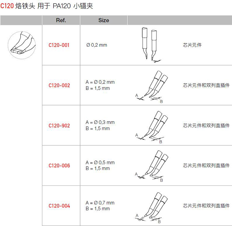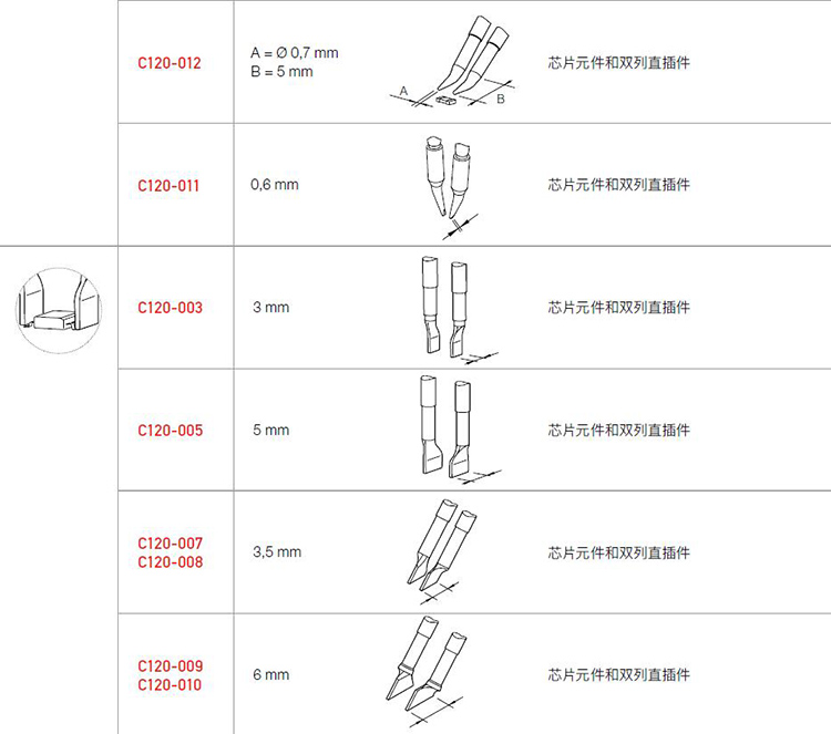 C120 型烙鐵頭可輕松焊接和拆焊芯片元件或雙列直插式元件,從而縮短處理時(shí)間。