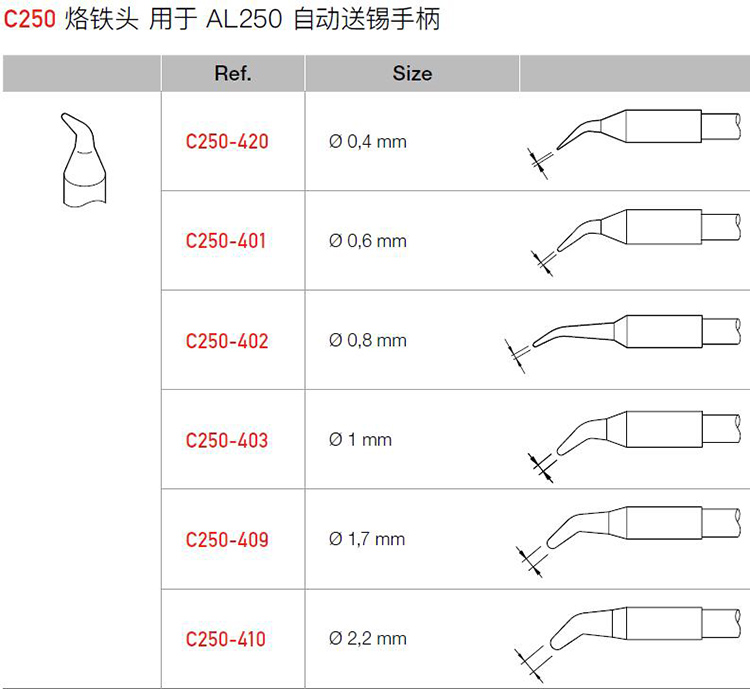 C250 型烙鐵頭經(jīng)過專門設(shè)計(jì),可與 AL250 自動(dòng)送錫烙鐵和