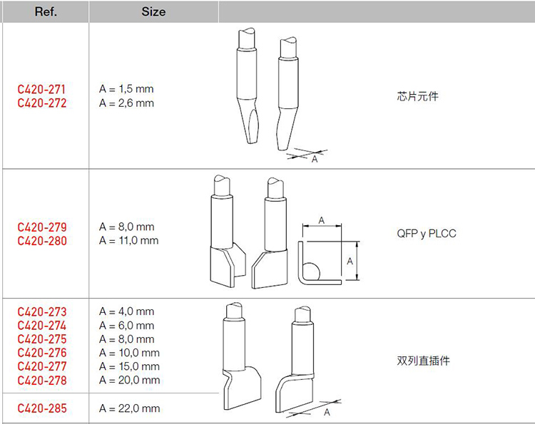 這些烙鐵頭特別適合拆焊芯片元件,QFP y PLCC,雙列直插件等。