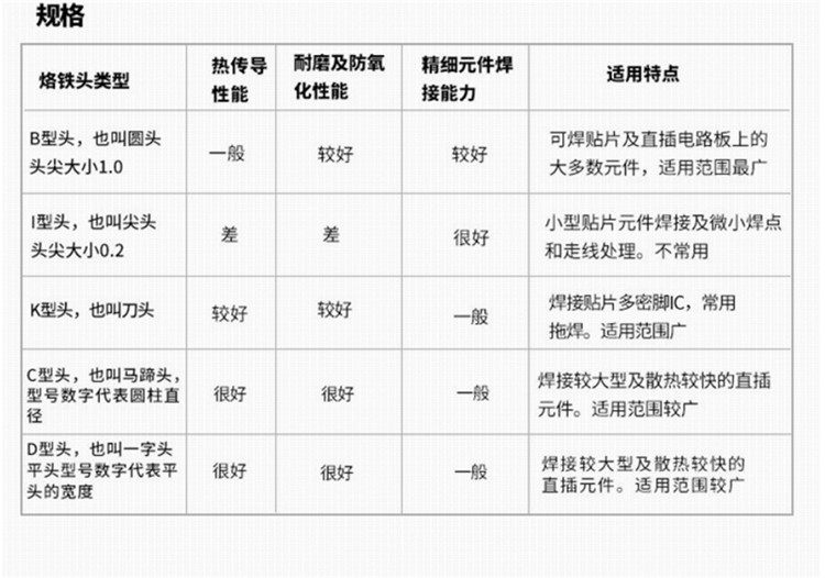 白光烙鐵頭適用: 900M系列適用于907ESD及933烙鐵上 900L系列適用于908ESD及934烙鐵上 900S系列適用于900SESD烙鐵上 918系列適用于918烙鐵上 920系列適用于920/921/922烙鐵上 924系列適用于924烙鐵上 980系列適用于980/981烙鐵上 T4系列適用于953烙鐵上 T11系列適用于FX-901烙鐵上 T12系列適用于FX-951及FX-950焊臺(tái)上 T13系列適用于FM-2026烙鐵上 T14系列適用于957烙鐵上 T18系列適用于FX-8801及907ESD烙鐵上 T20系列適用于FX-8302烙鐵上 N452系列適用于N452/N453烙鐵上 N454系列適用于N454烙鐵上選擇正確的烙鐵頭尺寸和形狀是非常重要的,選擇合適的烙鐵頭能使工作更有效率及增加烙鐵頭之耐用程度。烙鐵頭之大小與熱容量有直接關(guān)系,烙鐵頭越大,熱容量相對(duì)越大,烙鐵頭越小,熱容量也越小。進(jìn)行連續(xù)焊接時(shí),使用越大的烙鐵頭,溫度跌幅越少。此外,因?yàn)榇罄予F頭的熱容量高,焊接的時(shí)候能夠使用比較低的溫度,烙鐵頭就不易氧化,增加它的壽命。一般來說,烙鐵頭尺寸以不影響鄰近元件為標(biāo)準(zhǔn)。選擇能夠與焊點(diǎn)充份接觸的幾何尺寸能提高焊接效率。