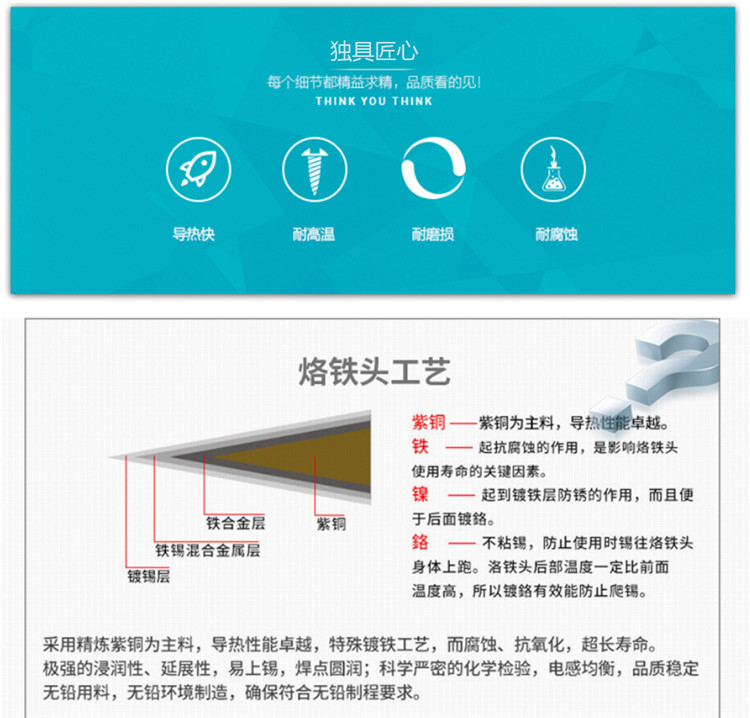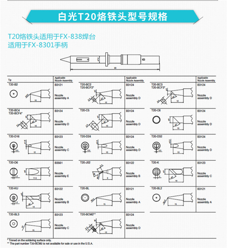白光烙鐵頭適用: 900M系列適用于907ESD及933烙鐵上 900L系列適用于908ESD及934烙鐵上 900S系列適用于900SESD烙鐵上 918系列適用于918烙鐵上 920系列適用于920/921/922烙鐵上 924系列適用于924烙鐵上 980系列適用于980/981烙鐵上 T4系列適用于953烙鐵上 T11系列適用于FX-901烙鐵上 T12系列適用于FX-951及FX-950焊臺(tái)上 T13系列適用于FM-2026烙鐵上 T14系列適用于957烙鐵上 T18系列適用于FX-8801及907ESD烙鐵上 T20系列適用于FX-8302烙鐵上 N452系列適用于N452/N453烙鐵上 N454系列適用于N454烙鐵上選擇正確的烙鐵頭尺寸和形狀是非常重要的,選擇合適的烙鐵頭能使工作更有效率及增加烙鐵頭之耐用程度。烙鐵頭之大小與熱容量有直接關(guān)系,烙鐵頭越大,熱容量相對(duì)越大,烙鐵頭越小,熱容量也越小。進(jìn)行連續(xù)焊接時(shí),使用越大的烙鐵頭,溫度跌幅越少。此外,因?yàn)榇罄予F頭的熱容量高,焊接的時(shí)候能夠使用比較低的溫度,烙鐵頭就不易氧化,增加它的壽命。一般來說,烙鐵頭尺寸以不影響鄰近元件為標(biāo)準(zhǔn)。選擇能夠與焊點(diǎn)充份接觸的幾何尺寸能提高焊接效率。
