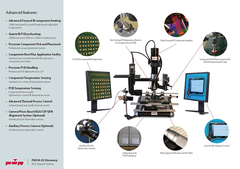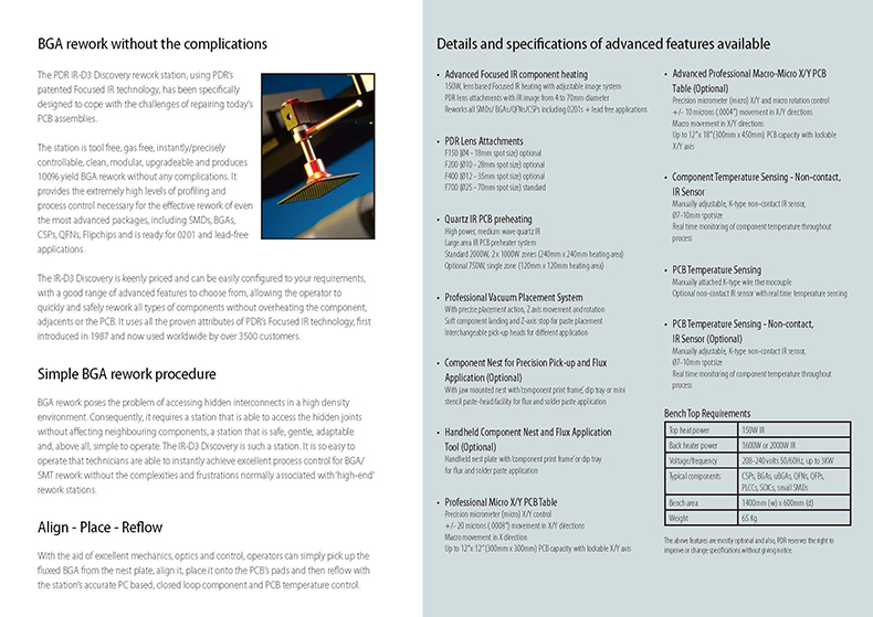 PDR IR-D3是一臺基礎型的返修系統(tǒng),機器同樣擁有專利的紅外聚焦加熱技術,整機模塊化組成,具有棱鏡光學對中系統(tǒng)、精密芯片拾取功能,自動曲線生成和分析軟件。可以返修包括SMD,BGA,CSP,QFN,F(xiàn)lipchips等芯片,提供了極高級別的分析和過程控制,并且可以用于0201和無鉛應用。