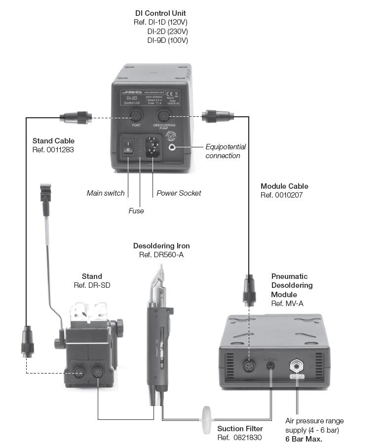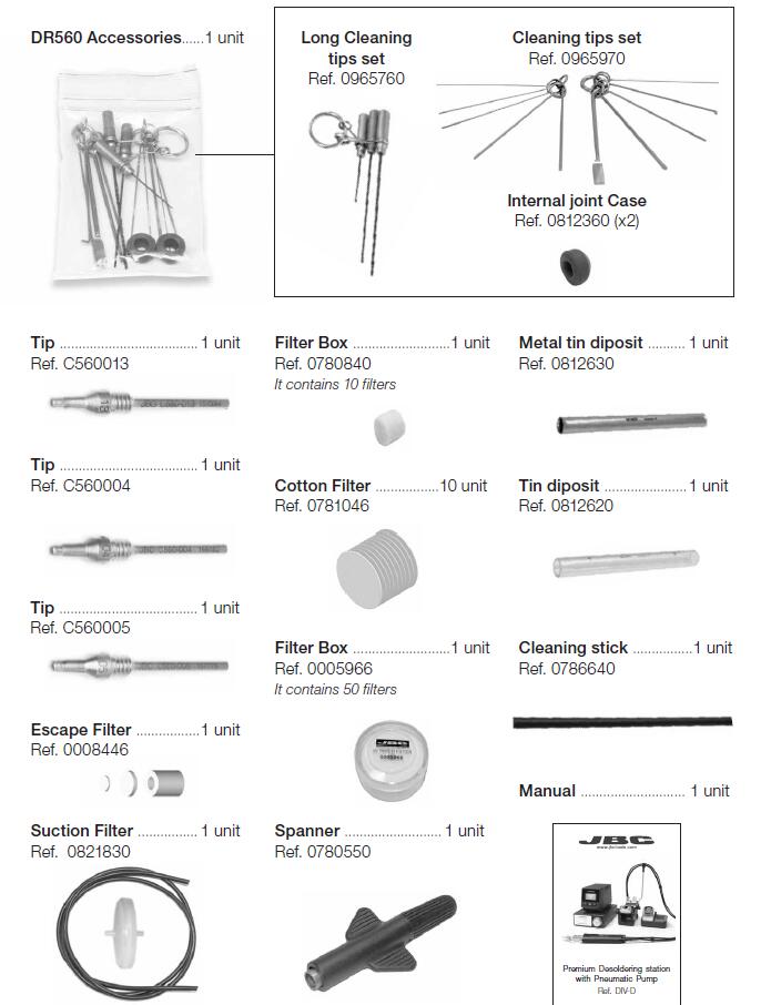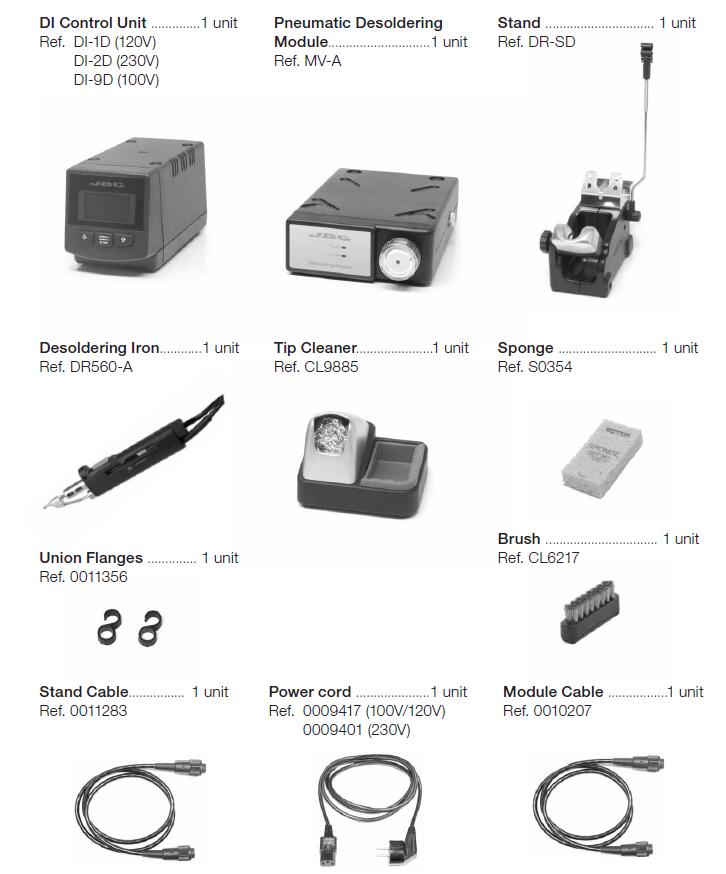 DI單焊具控制主機可以搭配任何JBC工具,DIV高階真空除錫解焊臺是搭配DR560吸錫烙鐵焊具和所有必要的配件。